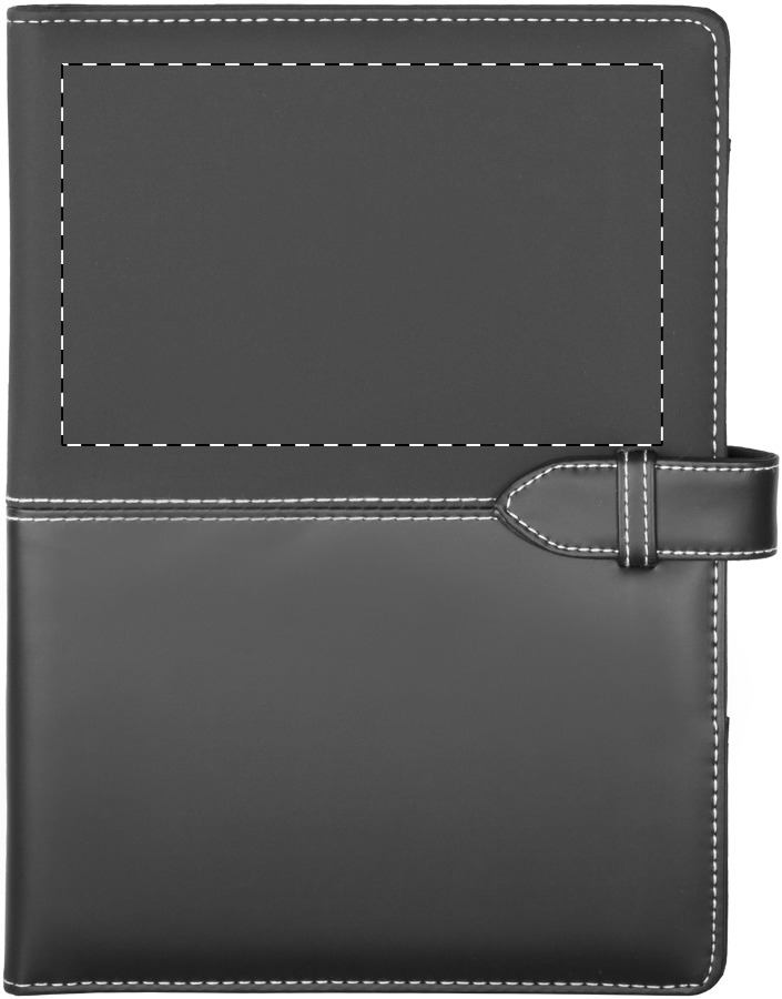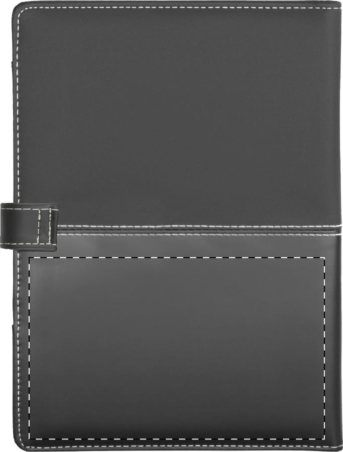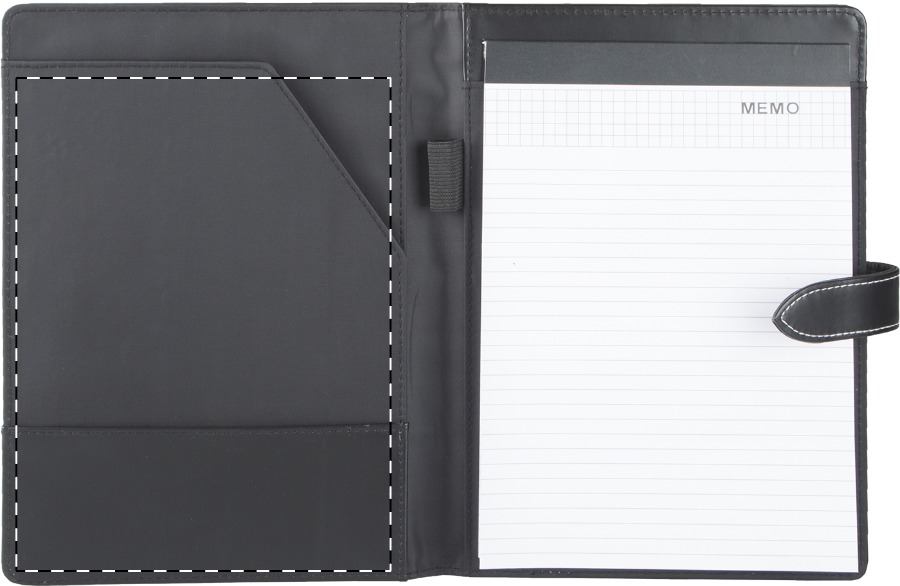 A5 Dokumentenmappe mit Notizblock mit 20 Seiten (liniert) und Stiftschlaufe. Material: Kunstleder.