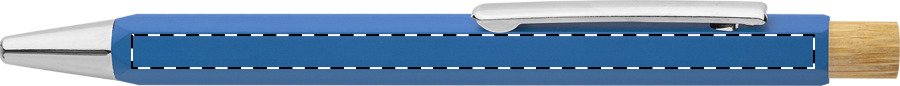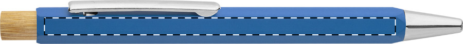 Sechseckiger Kugelschreiber aus recyceltem Aluminium mit Drücker aus Bambus und verchromten Elementen. Blauschreibend.