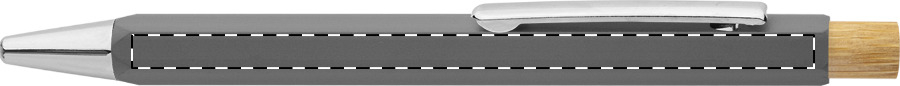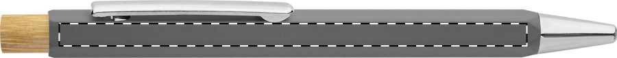 Sechseckiger Kugelschreiber aus recyceltem Aluminium mit Drücker aus Bambus und verchromten Elementen. Blauschreibend.